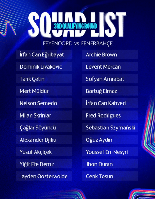 费内巴切官方公布了欧冠资格赛第三轮对阵费耶诺德的大名单。这份名单中,恩内斯里、弗雷德、阿姆拉巴特、什克里尼亚尔等核心球员悉数入选。其中在前锋线位置上,利雅得胜利过来的杜兰也是入选了大名单,成为了大家期待的焦点。毕竟作为身价顶级实力也在线的球员,杜兰也是足够强悍。